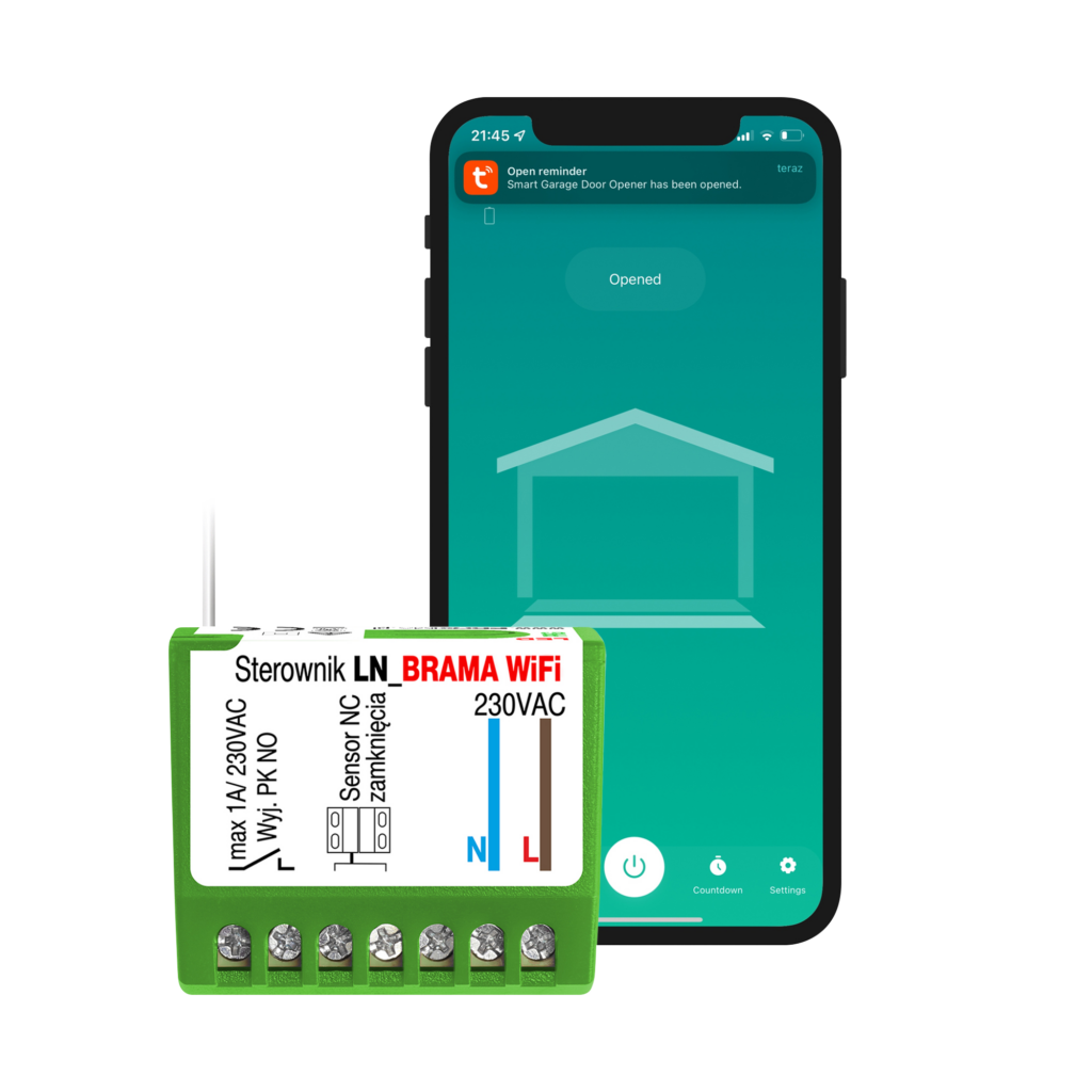 LN BRAMA Wi-Fi to inteligentny i uniwersalny system sterowania zaprojektowany do sterowania bramą. Integracja z bezpłatną aplikacją Tuya lub Smart Life zapewnia pełną kontrolę zdalną, umożliwiając otwieranie i zamykanie bramy za pośrednictwem smartfona z wykorzystaniem intuicyjnego interfejsu.